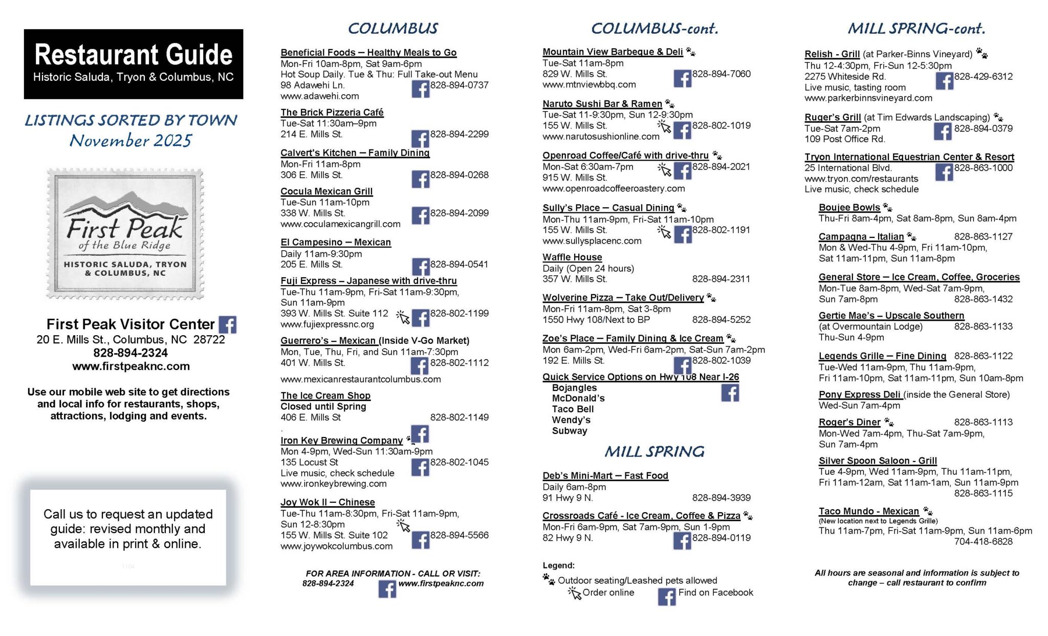 GUIDE: November 2025 Local Restaurant Info: We’ll help you find a great spot for a meal – use the First Peak Restaurant Guide to get the latest hours and information.