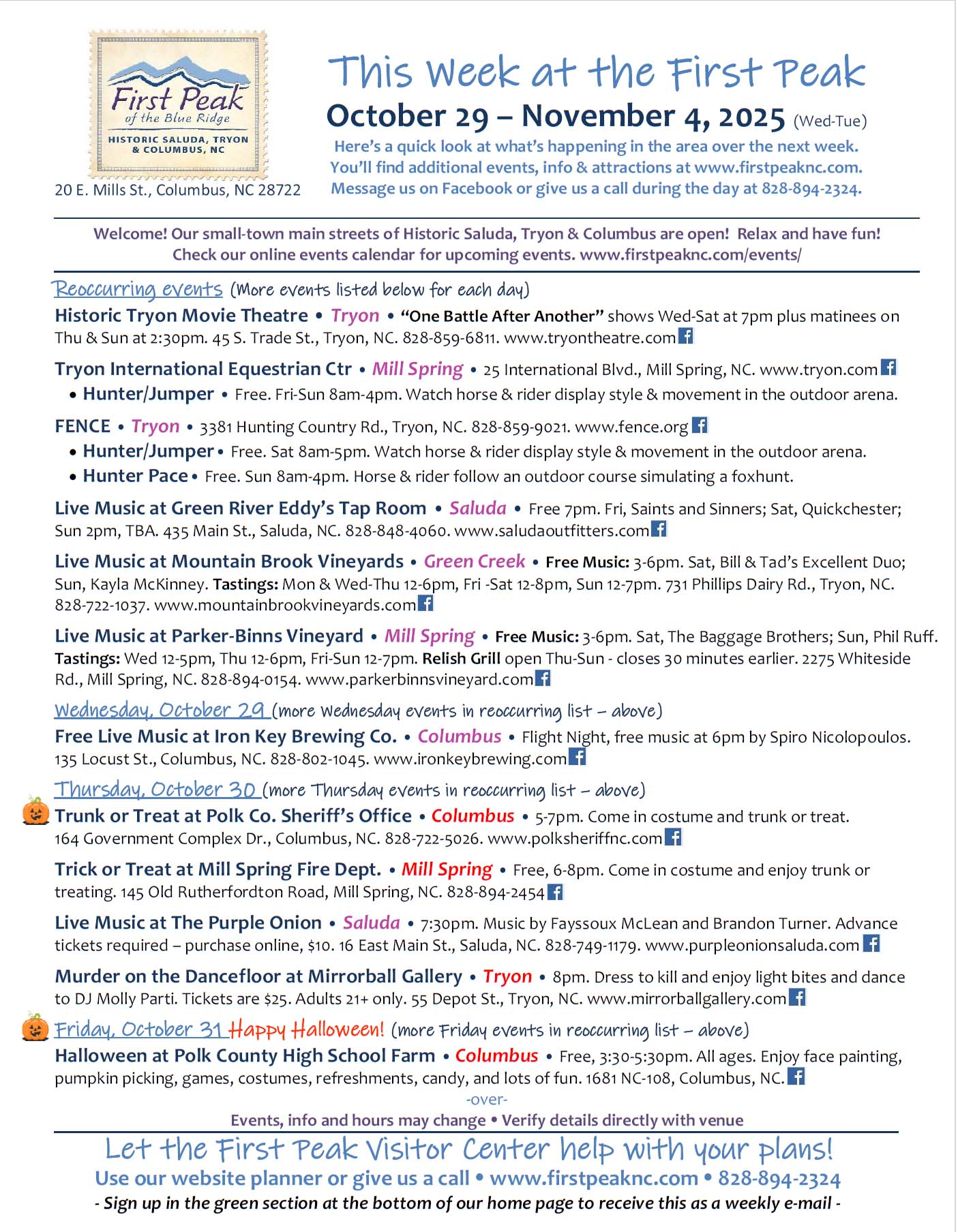 October 29 – November 4 EVENTS Quick View: Here’s a look at events happening around the First Peak of the Blue Ridge from October 29 – November 4, 2025.