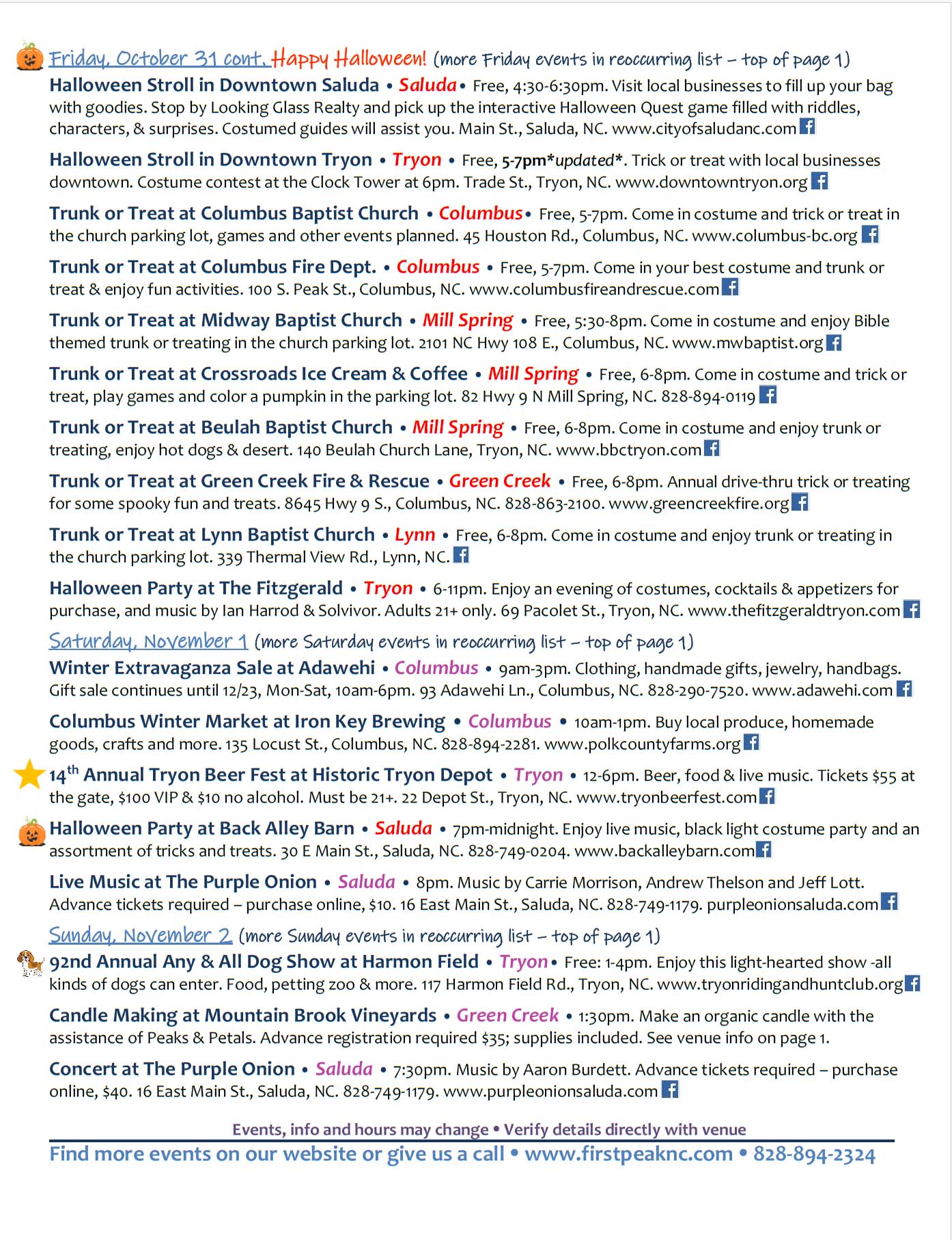 It’s time for Halloween! The calendar is packed with festivities for all ages – don’t miss out. And this week brings 2 favorite annual events – the 92nd Annual Any and All Dog Show is a lighthearted show for man’s best friend – all are welcome to join in the fun; and the 14th Annual Tryon Beer Fest promises a fun afternoon in downtown Tryon. Check them all out here in this week’s schedule.